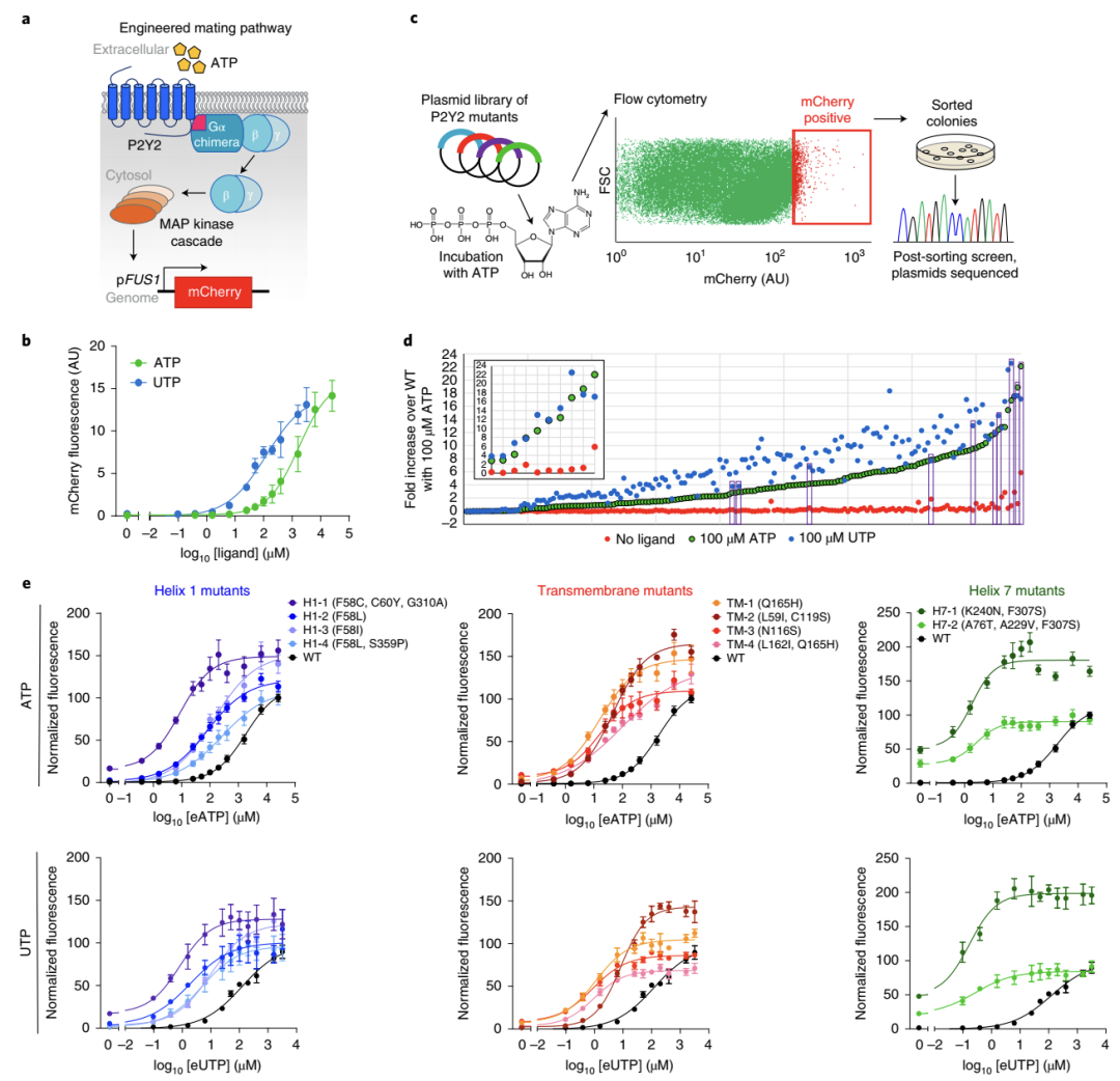 酵母菌在食品中的應(yīng)用較為廣泛,有一個(gè)明確的信號(hào)轉(zhuǎn)導(dǎo)途徑,即交配途徑,它可以在功能上與人G蛋白偶聯(lián)受體(GPCRs)相連,使蛋白質(zhì)的受控表達(dá)能夠響應(yīng)與人生理相關(guān)的刺激反應(yīng)。在這里,研究人員首先定向進(jìn)化了P2Y2受體,P2Y2受體是一種GPCR受體,可感知eATP和細(xì)胞外尿苷三磷酸(eUTP)。與野生的人P2Y2受體相比,工程P2Y2受體對(duì)eATP和eUTP都更敏感。確定好P2Y2受體后,研究人員通過嵌合酵母Gpa1人Gαi3蛋白將人P2Y2受體與酵母交配途徑偶聯(lián),使得這種基于酵母的工程益生菌可以表達(dá)人類P2Y2嘌呤能受體,而eATP敏感性增加了1,000 倍。