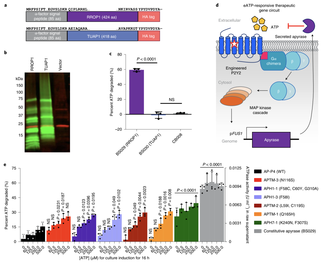 隨后,為了能讓益生菌感知促炎性分子并與之中和,研究人員將這種工程化P2Y2受體的激活與腺苷三磷酸雙磷酸酶的分泌聯(lián)系起來,腺苷三磷酸雙磷酸酶是一種ATP降解酶,它可以水解促炎性eATP并參與其轉(zhuǎn)化為免疫抑制腺苷。研究人員使用基于CRISPR-Cas9的方法,將傳感(P2Y2)和響應(yīng)(RROP1)元素共同引入相同酵母菌株的基因組,產(chǎn)生了一種對(duì)eATP的生理水平作出反應(yīng)而分泌功能性ATPase的酵母菌株。